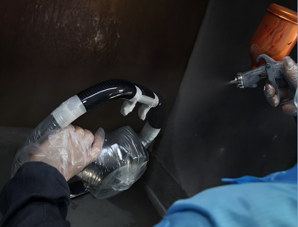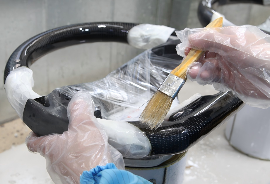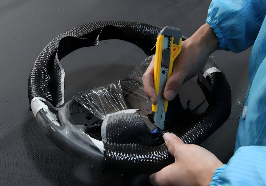 The completed steering wheel undergoes final quality checks, now a perfect fusion of advanced carbon fiber technology and exquisite craftsmanship, ready to elevate your driving experience.