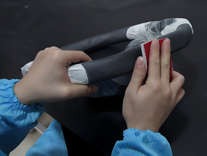 The hardened carbon fiber surface undergoes precision sanding to remove imperfections and create a perfectly smooth base for the next stages.
